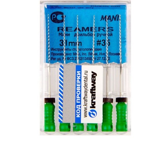 Ример № 35 Mani предназначается для прохождения и расширения зубных каналов при лечении осложненных случаев кариеса. Благодаря длине 31 мм, высокой прочности и гибкости может применяться для искривленных каналов.